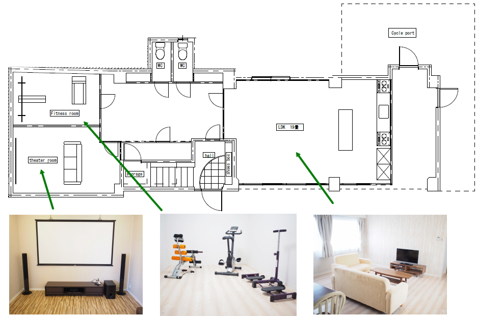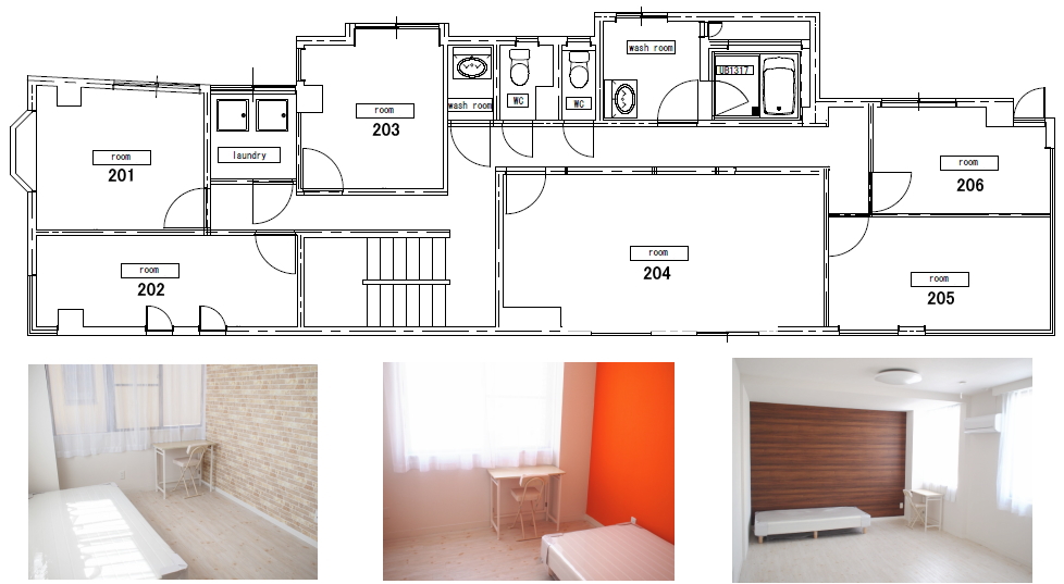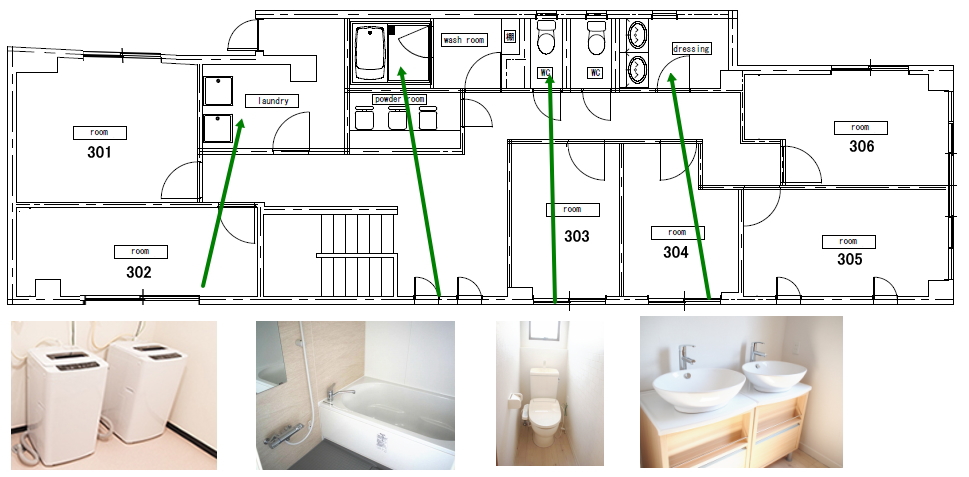 | 共用設備 | キッチン×2、大型テレビ、冷蔵庫×2、ソファー、洗濯機×4、エアコン、インターホン、浴槽×2、トイレ×6、下駄箱、etc |
